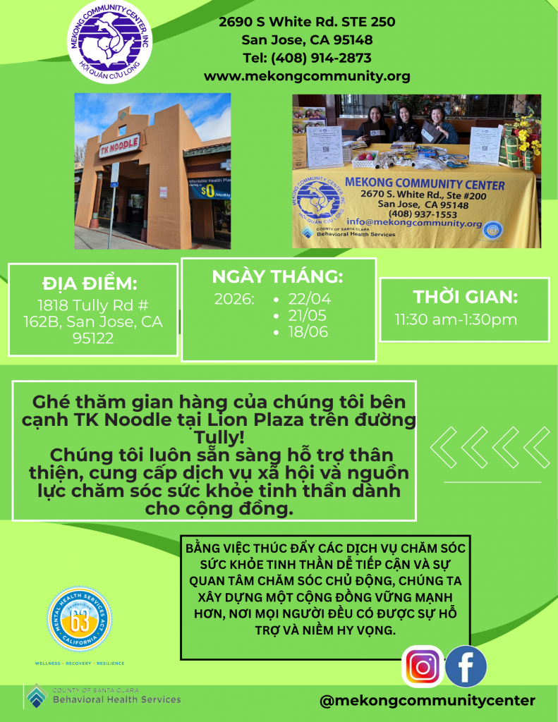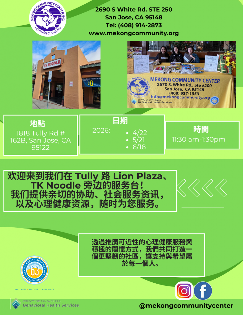 - What: Community resource booth offering friendly support, social services, and mental health resources & Mekong Wellness Center