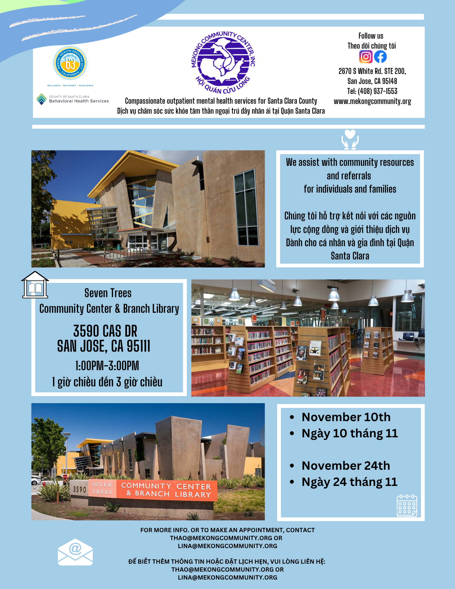 Seven Trees Branch Library 3590 Cas Drive, San Jose, CA, United StatesWe assist with community resources and referrals for individuals and families. Come see us between 1:00PM – 3:00PM on: Monday, November 10, 2025 Monday, November 24, 2025 Seven Trees Community Center & Branch Library 3590 Cas Dr. San Jose, CA 95111 For more info or to make an appointment, contact Thao@mekongcommunity.org Lina@mekongcommunity.org