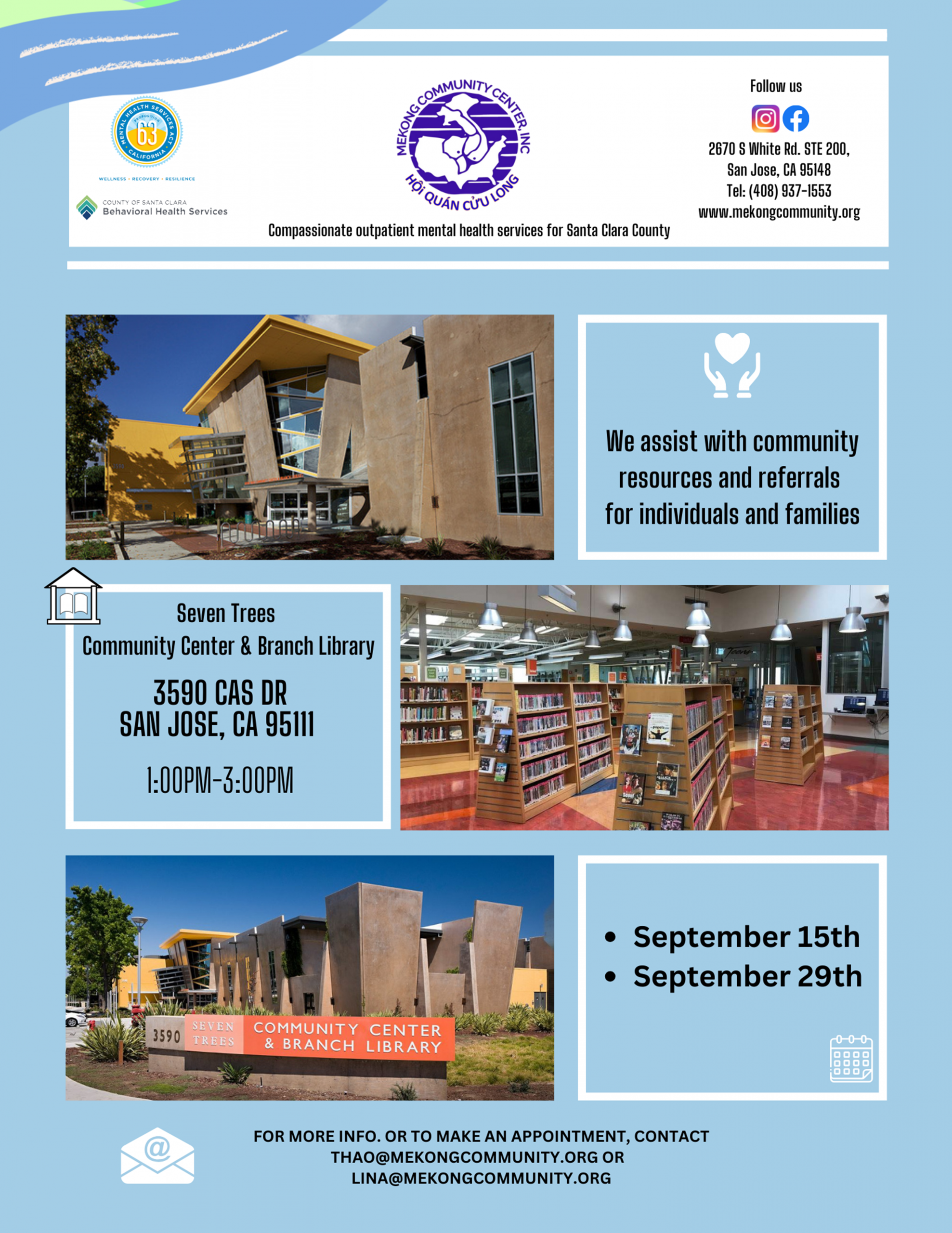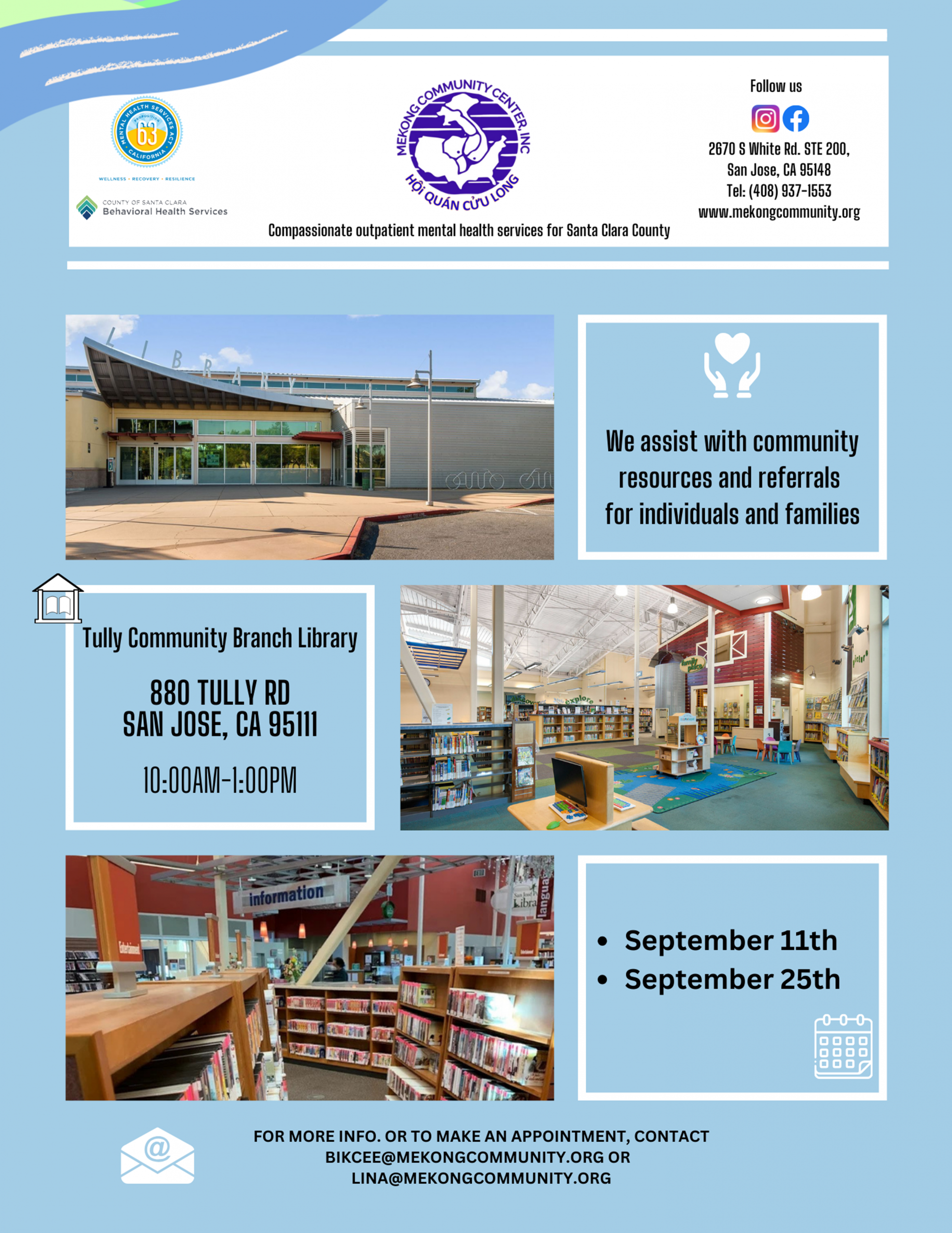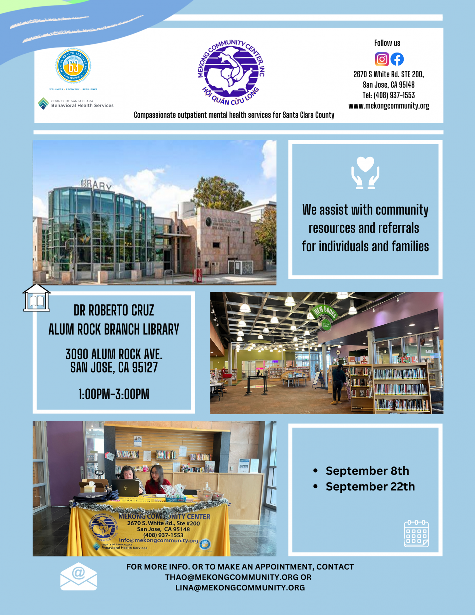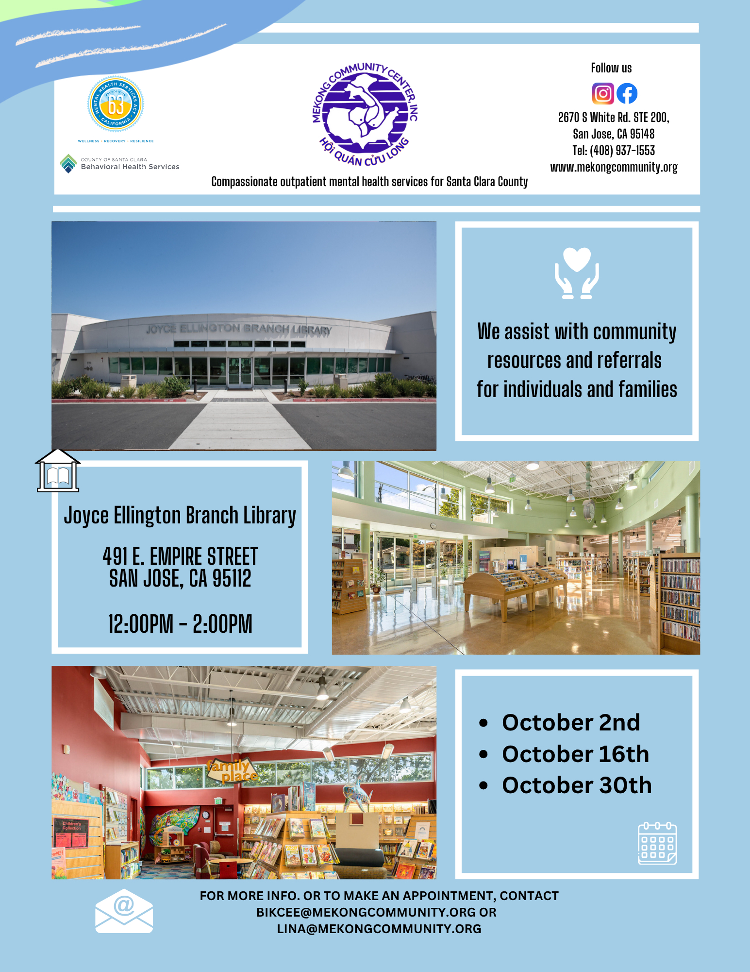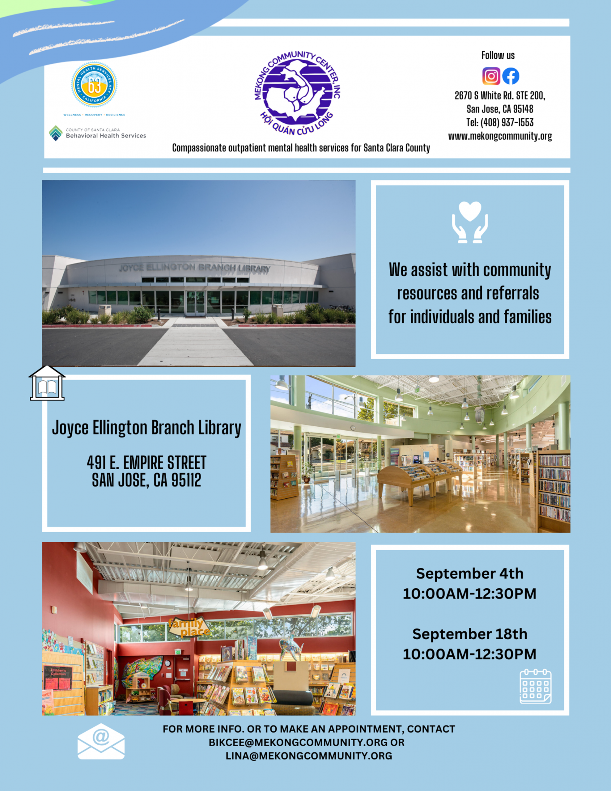 Joyce Ellington Branch Library 491 E. Empire St., San Jose, CA, United StatesWe assist with community resources and referrals for individuals and families. Come see us between 10:00 AM – 12:30 PM on: Thursday, September 4, 2025 Joyce Ellington Branch Library 491 E. Empire St. San Jose, CA 95112 For more info or to make an appointment, contact Bikcee@mekongcommunity.org Lina@mekongcommunity.org