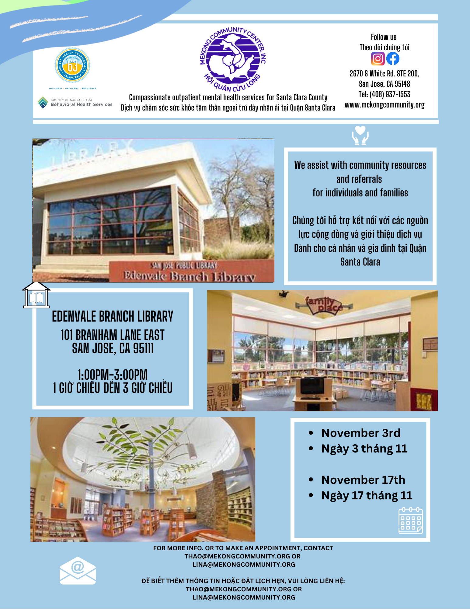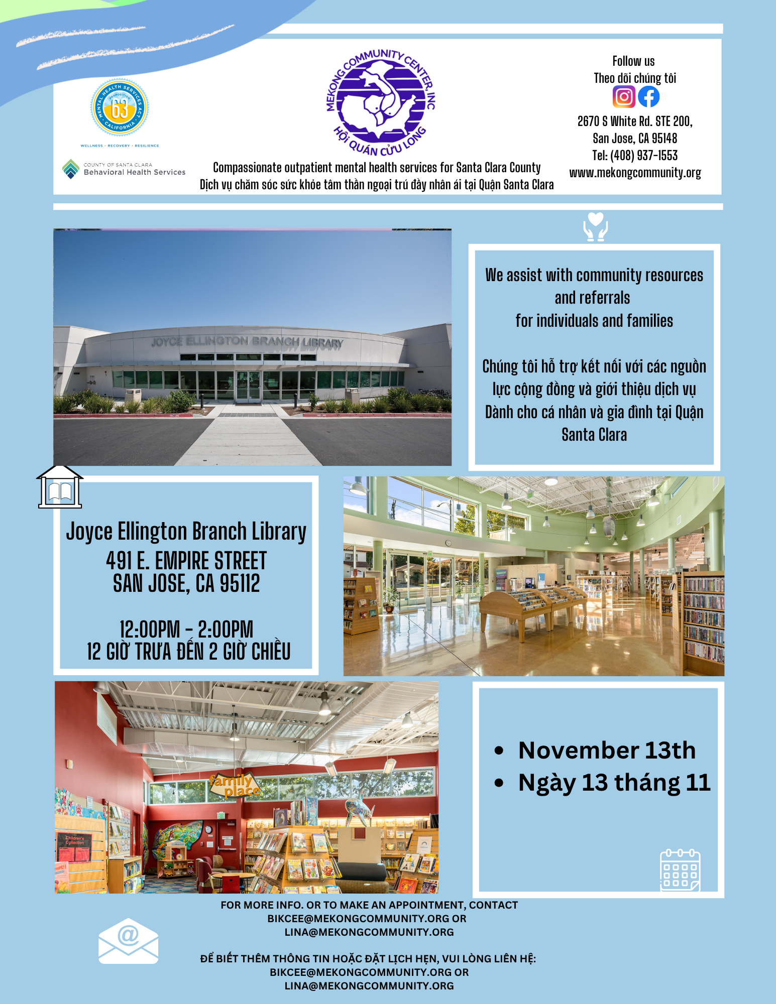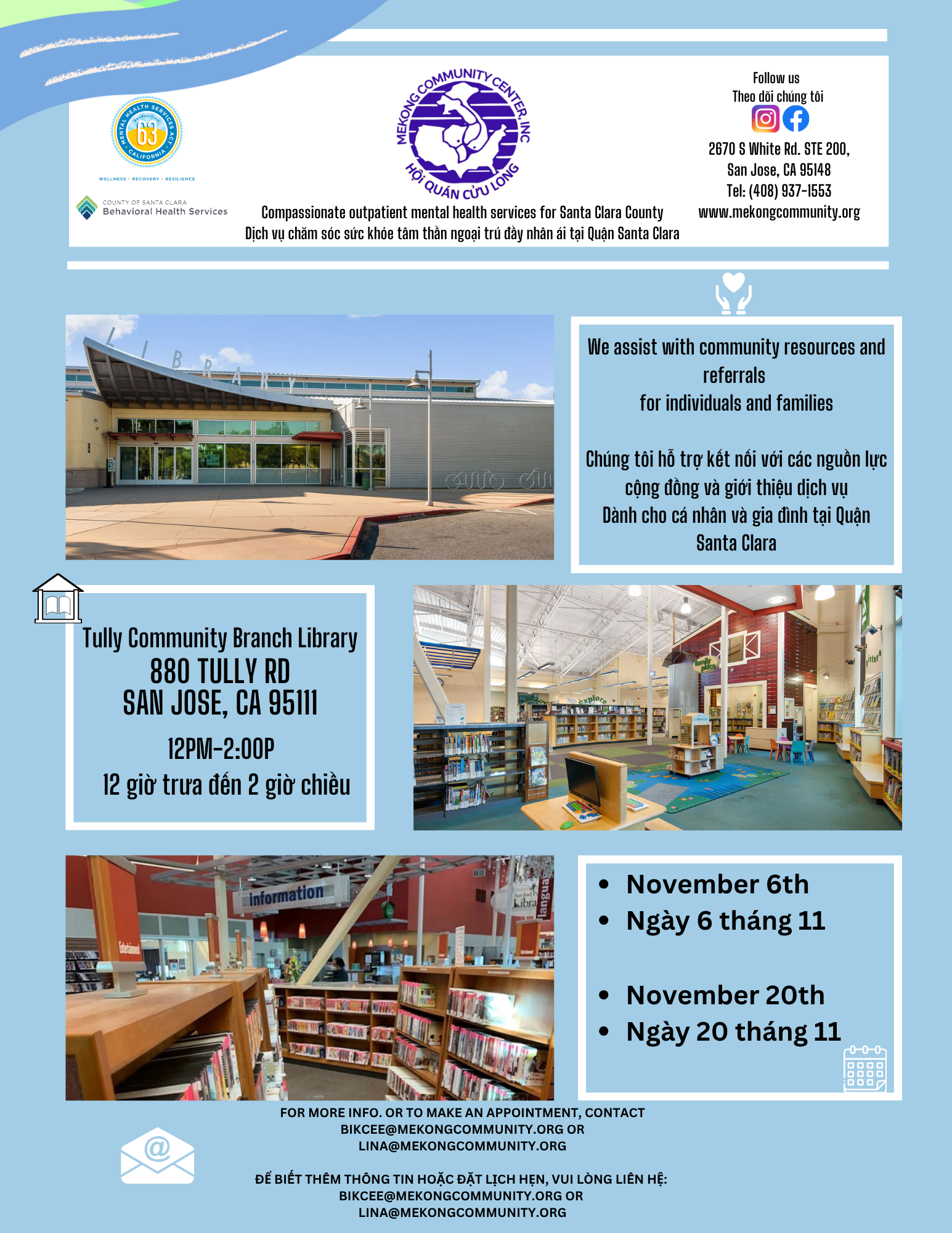 We assist with community resources and referrals for individuals and families. Come see us between 1:00PM – 3:00PM on: Monday, October 27, 2025 Seven Trees Community Center & Branch Library 3590 Cas Dr. San Jose, CA 95111 For more info or to make an appointment, contact Bikcee@mekongcommunity.org Lina@mekongcommunity.org